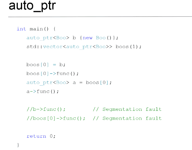 (передаём значение, а сами становимся nullptr) - стандарт 98 - std::auto_ptr (в 2017 удалили). Можем неявно передать владение (Ex. вектор таких объектов(см. слайд))